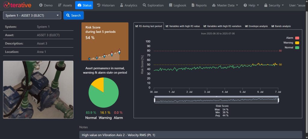 Aplicación de mantenimiento predictivo de activos industriales a partir del análisis de mediciones de diversas variables y la utilización de algoritmos de Inteligencia Artificial. Permite visualizar de manera interactiva el estado de los activos y los espectros de frecuencia.